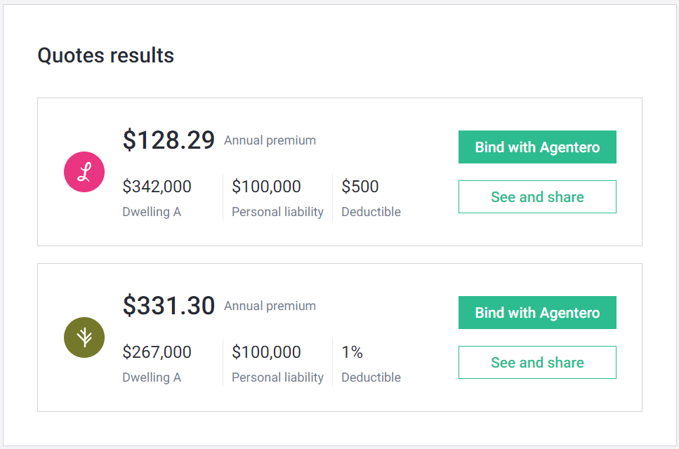 On the Quotes tab, you can see all your quotes, click on an individual quote to see or share it, or click the 3 vertical dots next to the quote where you can request to "Bind with Agentero."